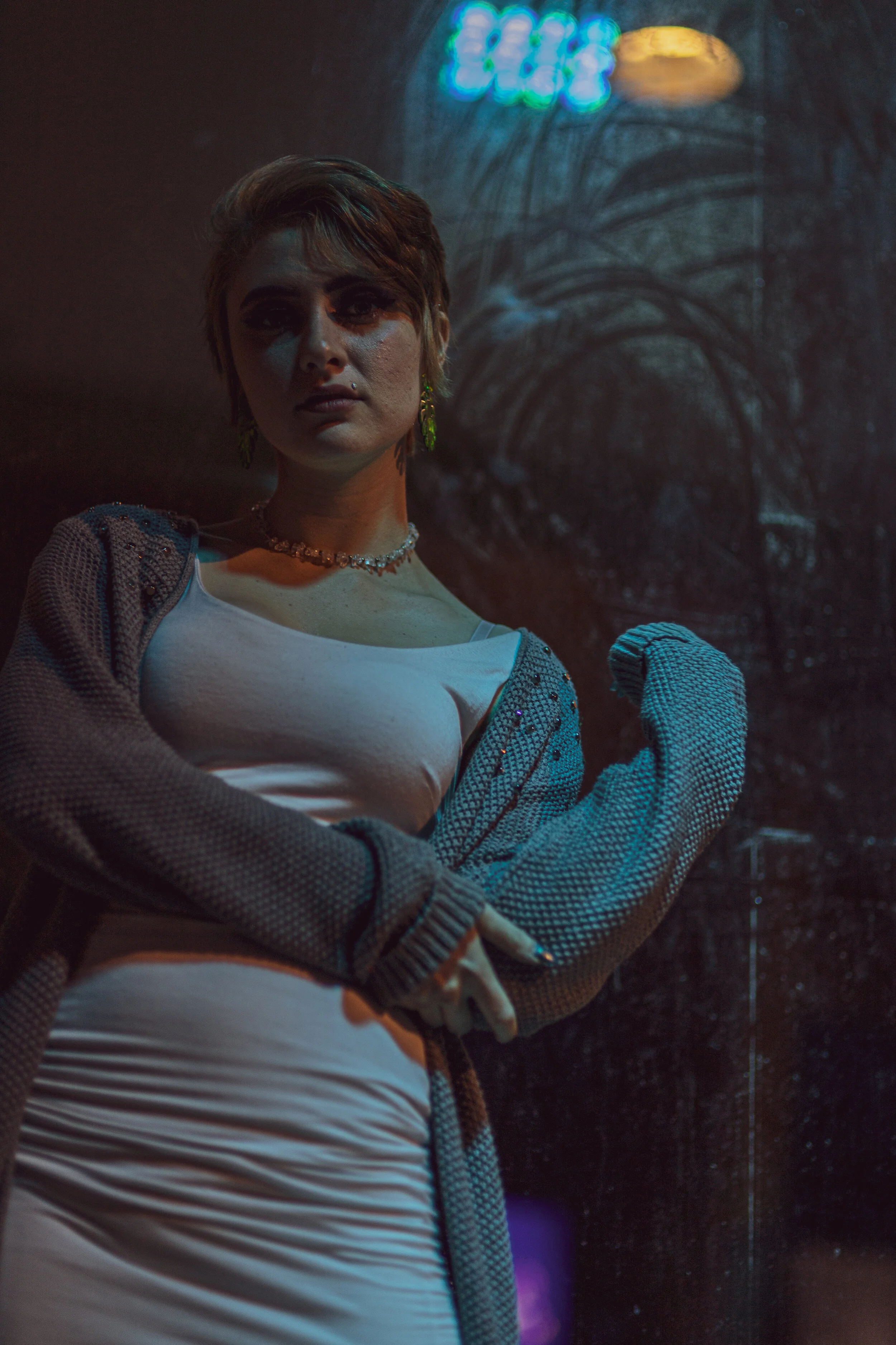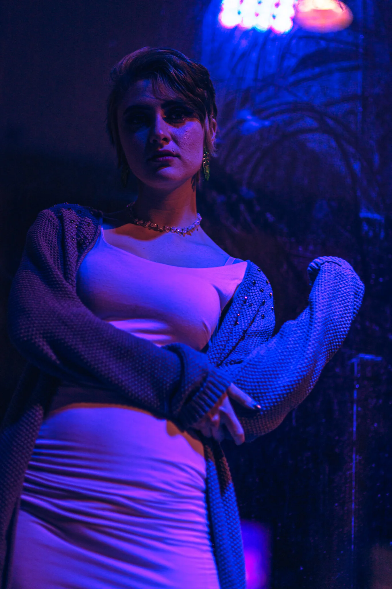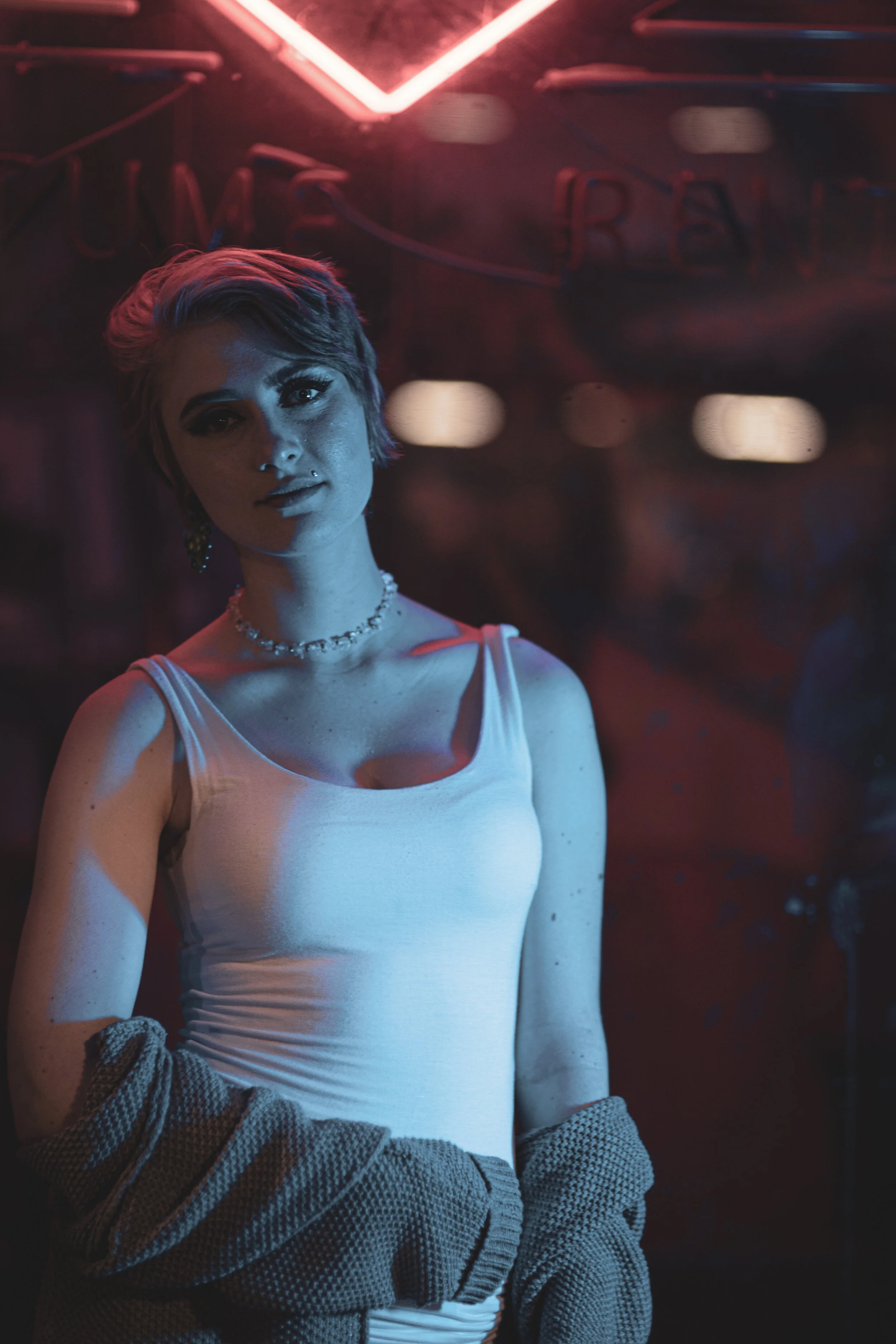 A young woman with short hair and makeup, wearing a white tank top, jewelry, and a sweater draped over her arms, standing in a dimly lit environment illuminated by pink and blue neon lights.