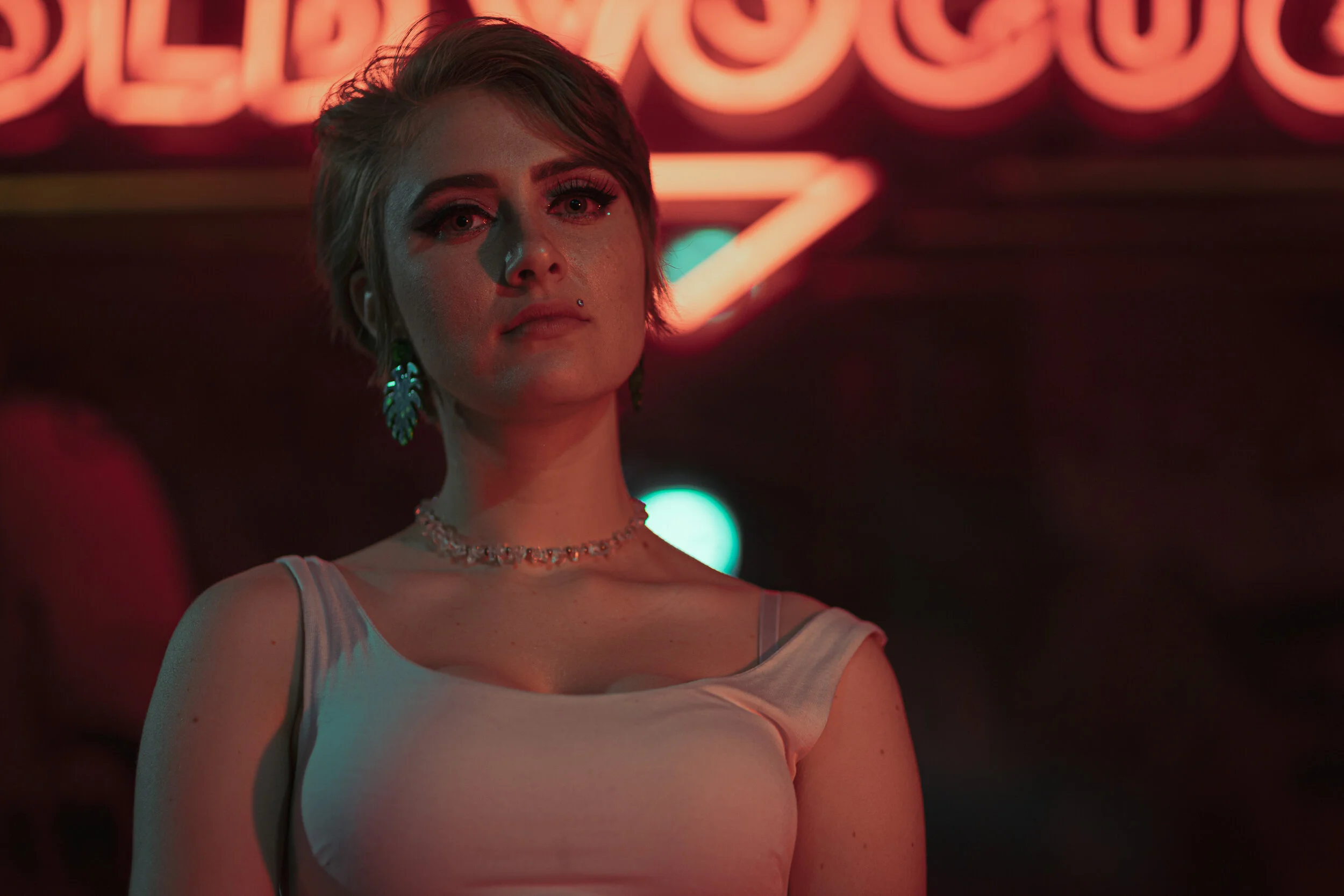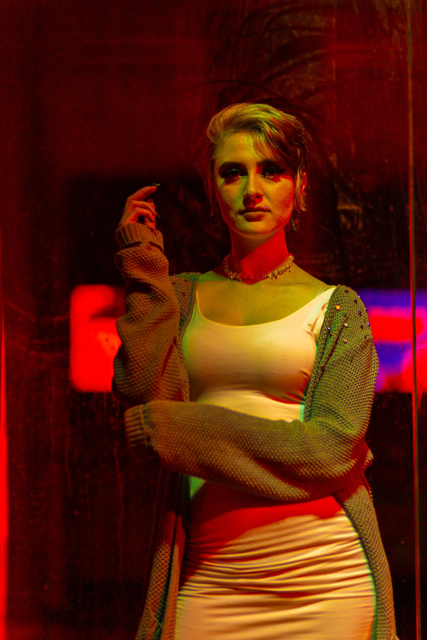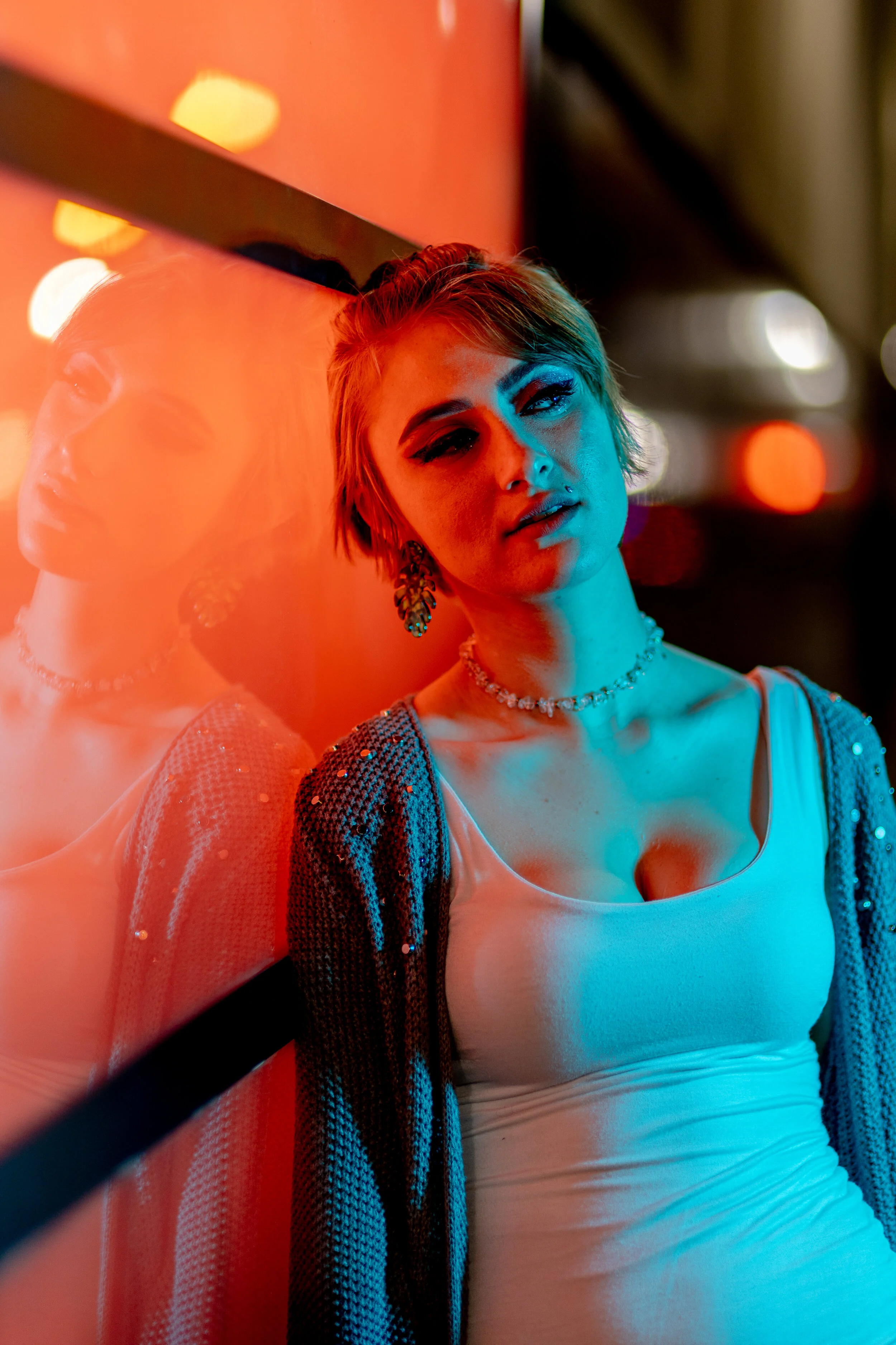 A young woman with short blonde hair leans against a reflective glass wall at night, illuminated by colorful red and blue neon lights, wearing a white tank top and accessories.
