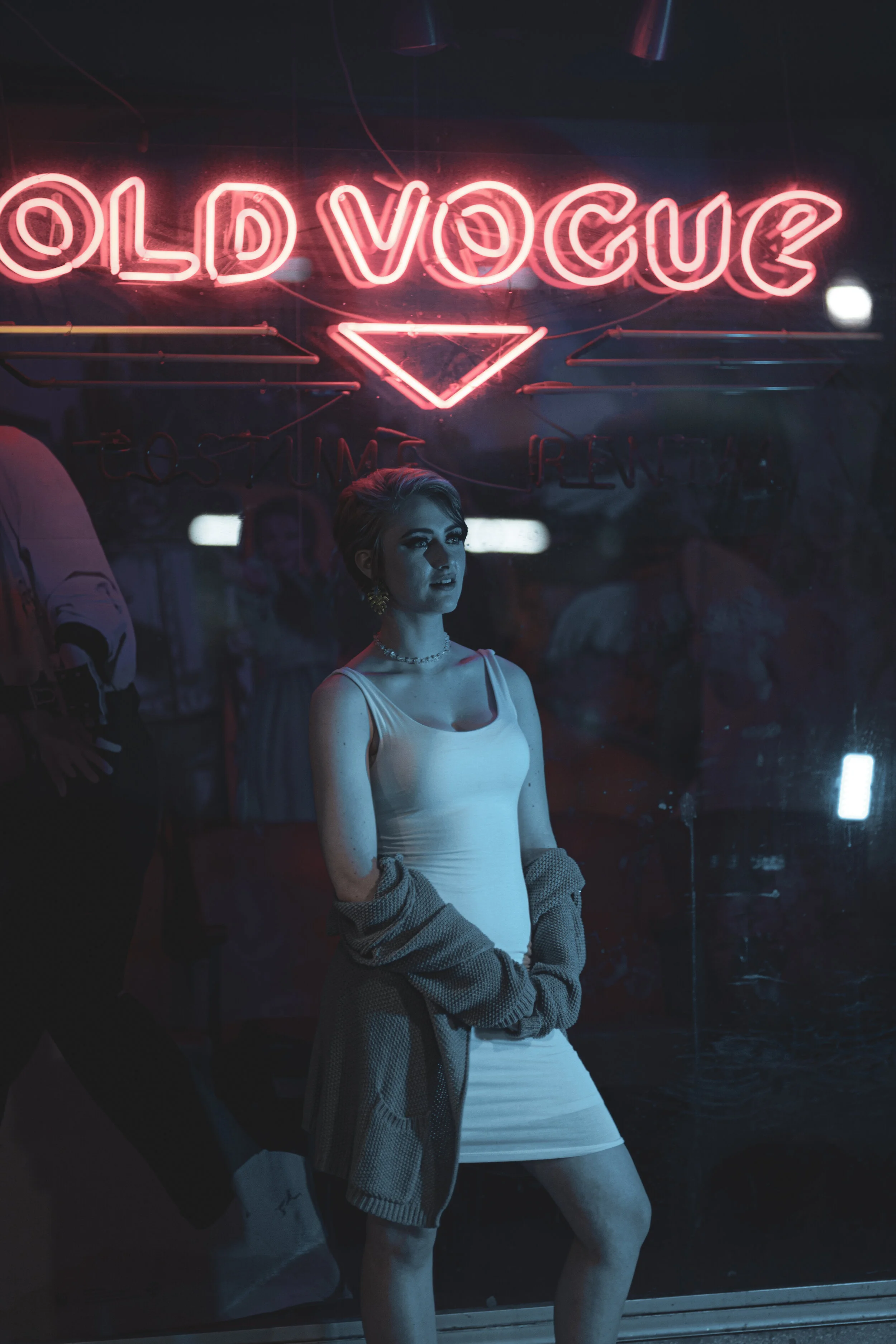 A woman with short hair and green earrings in a white tank top stands in front of red neon signs that read "OLD VOGUE" and "COSTUME PENT". The signs are reflected on a glass surface behind her.