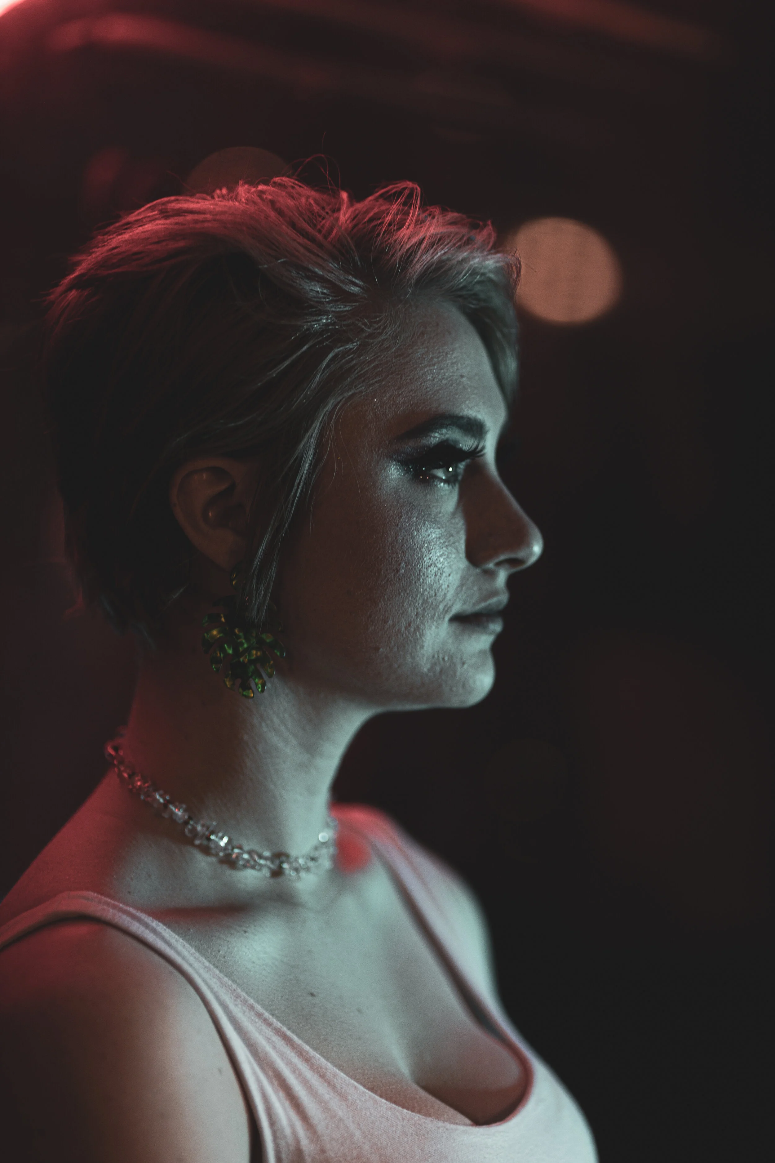Profile of a woman with short hair, earrings, and a chain necklace, illuminated by soft pink and green lighting, against a dark background.